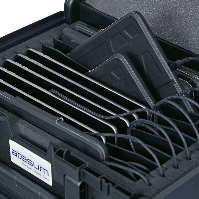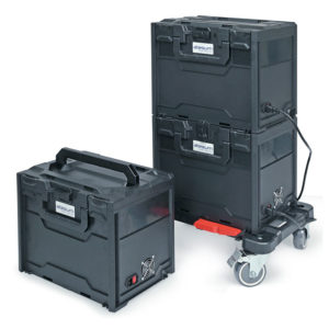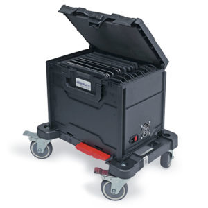 Die robusten Ladeboxen aus hochwertigem Kunststoff sind stapel- und arretierbar, um ein sicheres Transportieren zu gewährleisten. Im Inneren des Koffers befindet sich eine anthrazitfarbige Hartschaumeinlage mit Einlagefächern, welche die portablen Geräte aufnehmen. Diese sind damit optimal vor Erschütterungen geschützt und ein gleichzeitiges Aufladen der Geräte ist möglich, auch bei geschlossenem Deckel. Der Stromanschluss mit Schalter, wie auch weitere (optionale) Anschlüsse sind seitlich, rechts aussen, vorhanden. Im Boden des Koffers ist genügend Platz für das Verstauen von EU- / CH-Steckdosenleisten, Charger USB-A oder USB-C.